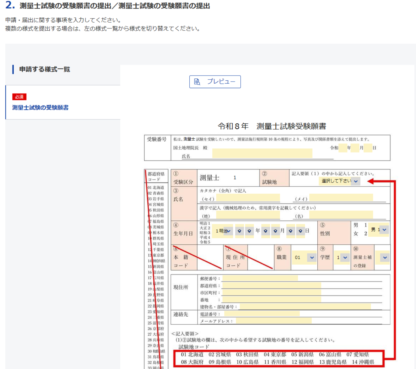 ①②の基本情報と、③測量士補・測量士の受験願書の提出>申請する様式一覧 があります。どちらもすべて入力する必要があり、例えば、住所と氏名は複数回入力することになります。